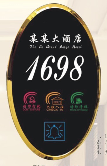 专为酒店精心设计的酒店门牌房态显示门铃,1路“请勿打扰”,1路“请即清理”指示,电容式触摸门铃开关完全可以取代传统机械门铃开关,当客房主人不想被打扰时,按下放内“请勿打扰”开关,门铃显示器上“请勿打扰”指示灯亮,触摸门铃按键时门铃不响,当客人离开后,按下房间内“请即清理”开关,触摸屏的“请即清理”图案背光被点亮,让服务员很清晰的知道客房需要清理的请求